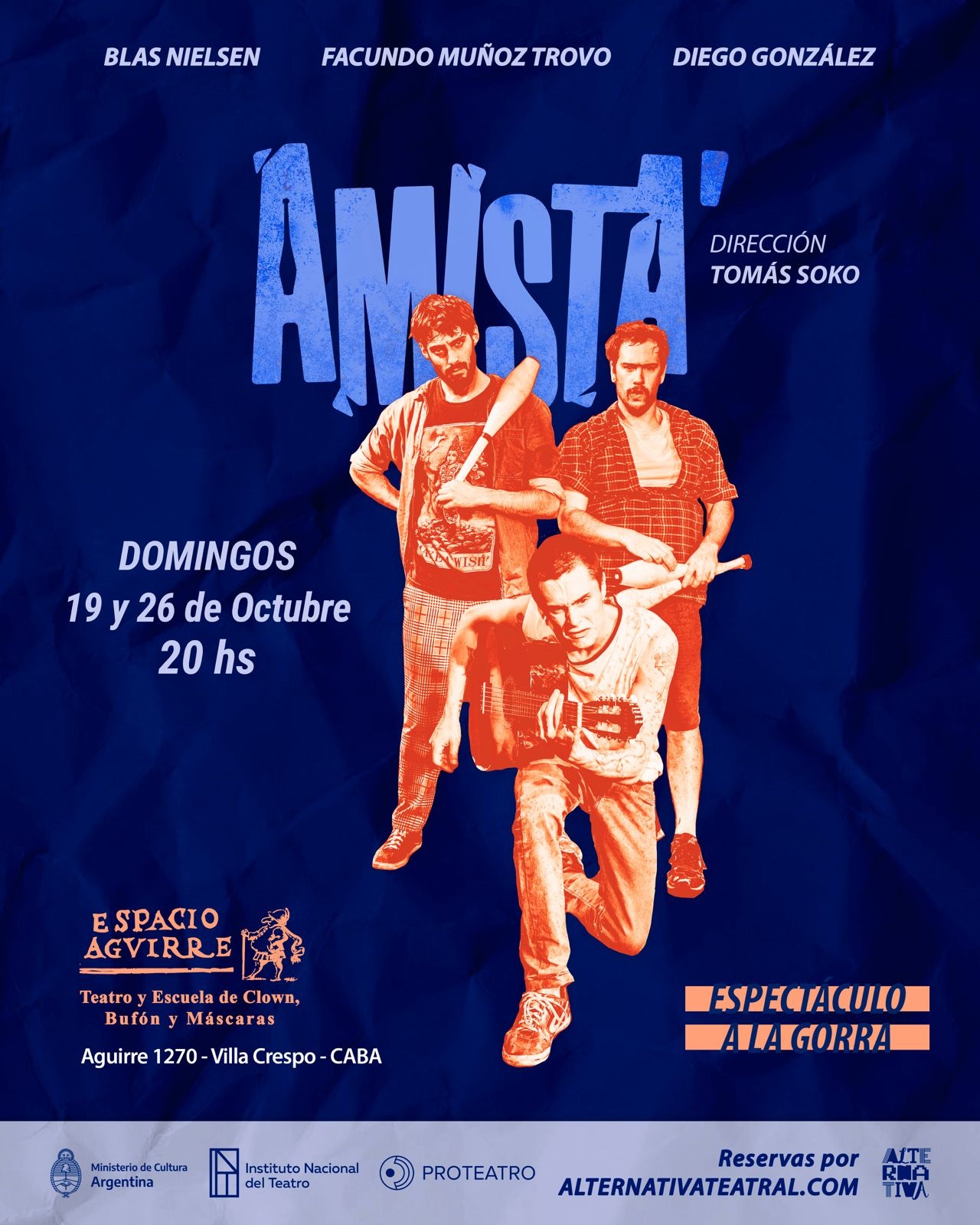 AMISTA' es una ventana a la intimidad de tres malabaristas de semáforo, aquello que los automovilistas y peatones nunca llegarán a ver en la senda peatonal. La lucha por la supervivencia, la obsesión por el juego, la angustia de no ser y el miedo al fracaso. Y en el otro extremo, la fiesta, la amistad y la complicidad. Es un bascular constante para revelar la otra cara de la moneda, la que no sale la calle. Una montaña rusa, absurda y delirante para reivindicar el género y llevarlo hacia otros horizontes que nunca tendrán tiempo de existir en 1 minuto de luz roja.